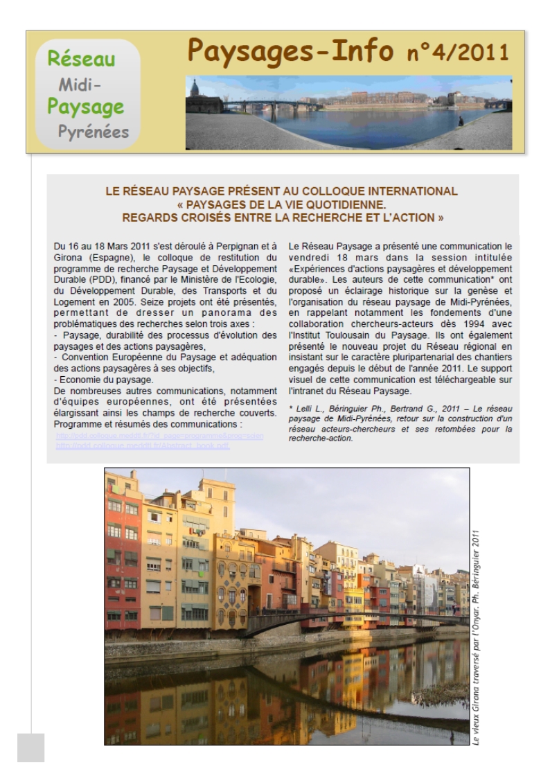 vendredi 18 mars dans la session intitulée «Expériences d’actions paysagères et développement durable». Les auteurs de cette communication ont proposé un éclairage historique sur la genèse et l’organisation du réseau paysage de Midi-Pyrénées, en rappelant notamment les fondements d’une collaboration chercheurs-acteurs dès 1994 avec l’Institut Toulousain du Paysage. Ils ont également présenté le nouveau projet du Réseau régional en insistant sur le caractère pluripartenarial des chantiers engagés depuis le début de l’année 2011.